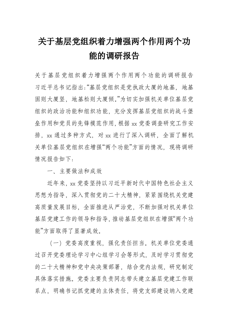 关于基层党组织着力增强两个作用两个功能的调研报告