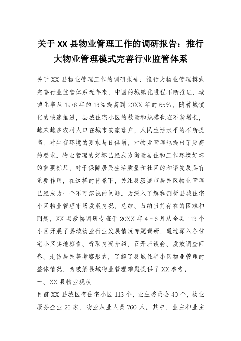 关于XX县物业管理工作的调研报告:推行大物业管理模式完善行业监管体系