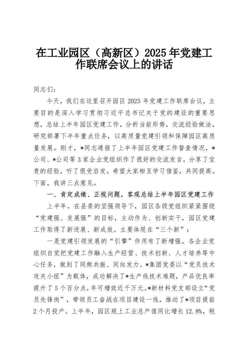 在工业园区(高新区)2025年党建工作联席会议上的讲话