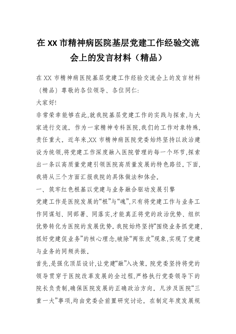 在XX市精神病医院基层党建工作经验交流会上的发言材料(精品)