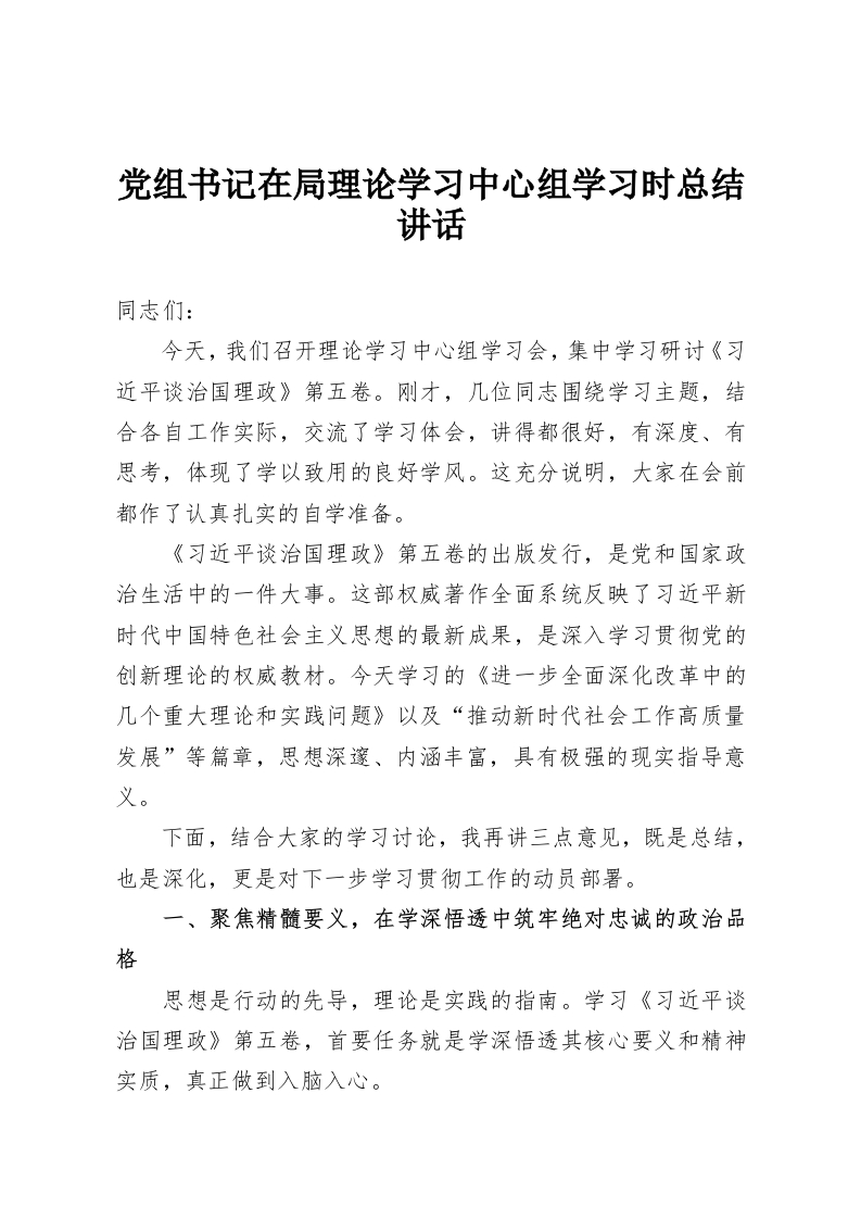 党组书记在局理论学习中心组学习时总结讲话