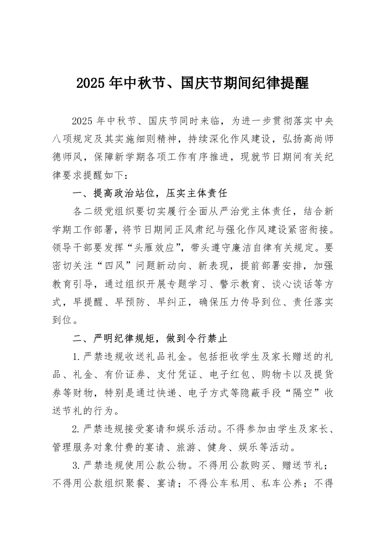 首页精选范文2025年中秋节、国庆节期间纪律提醒