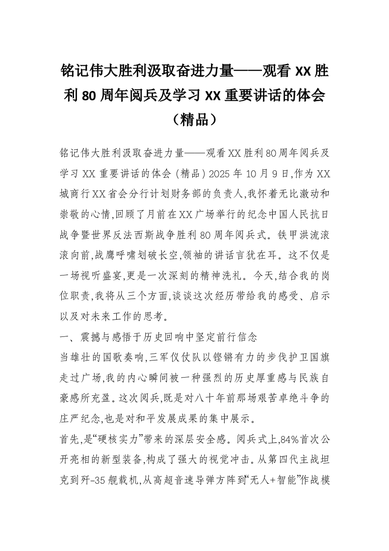 铭记伟大胜利汲取奋进力量——观看XX胜利80周年阅兵及学习XX重要讲话的体会(精品)