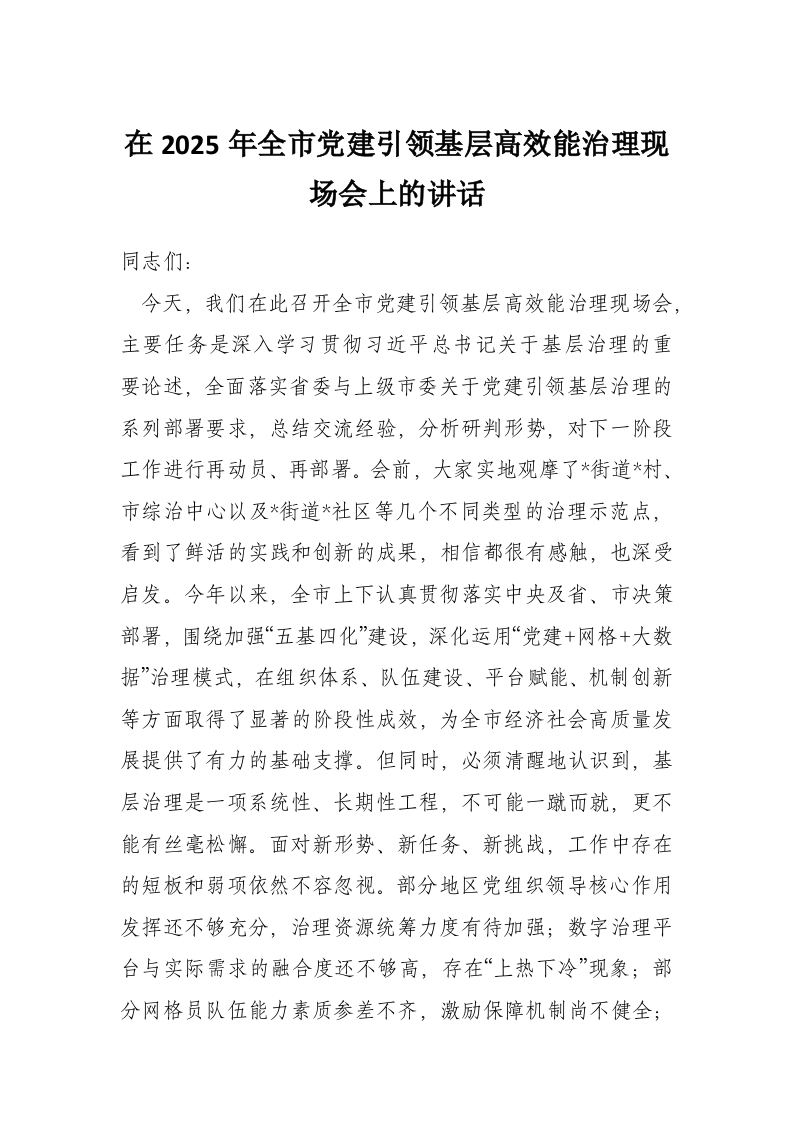在2025年全市党建引领基层高效能治理现场会上的讲话