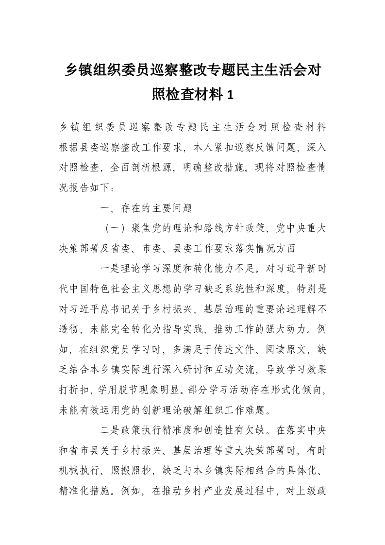 首页学习提升乡镇组织委员巡察整改专题民主生活会对照检查材料1