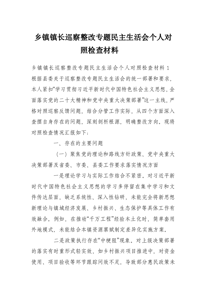 首页学习提升乡镇镇长巡察整改专题民主生活会个人对照检查材料​