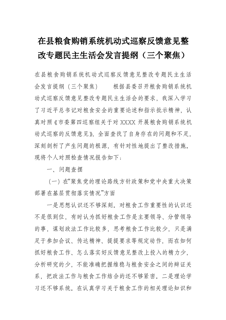 在县粮食购销系统机动式巡察反馈意见整改专题民主生活会发言提纲(三个聚焦)