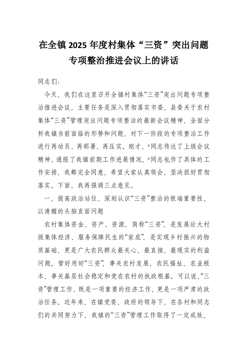 在全镇2025年度村集体“三资”突出问题专项整治推进会议上的讲话