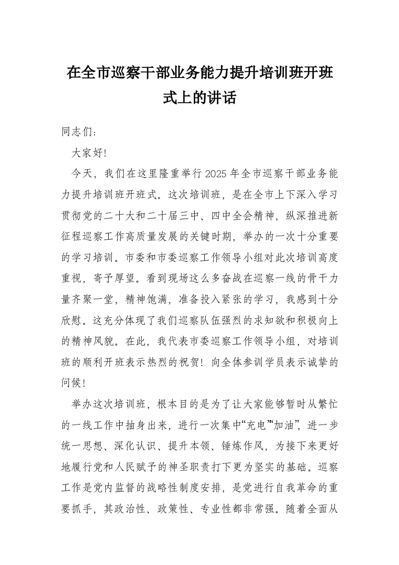 在全市巡察干部业务能力提升培训班开班式上的讲话