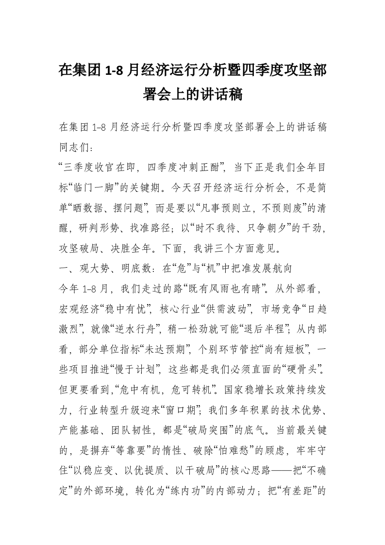 在集团1-8月经济运行分析暨四季度攻坚部署会上的讲话稿