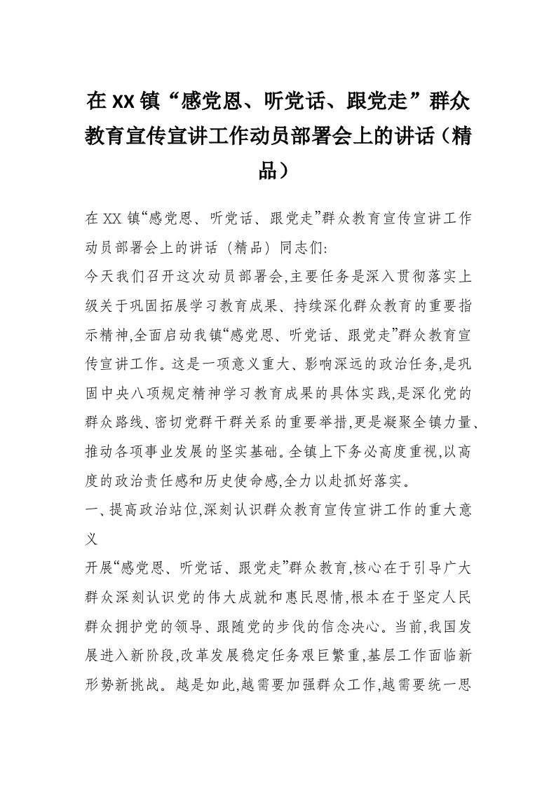 在XX镇“感党恩、听党话、跟党走”群众教育宣传宣讲工作动员部署会上的讲话(精品)