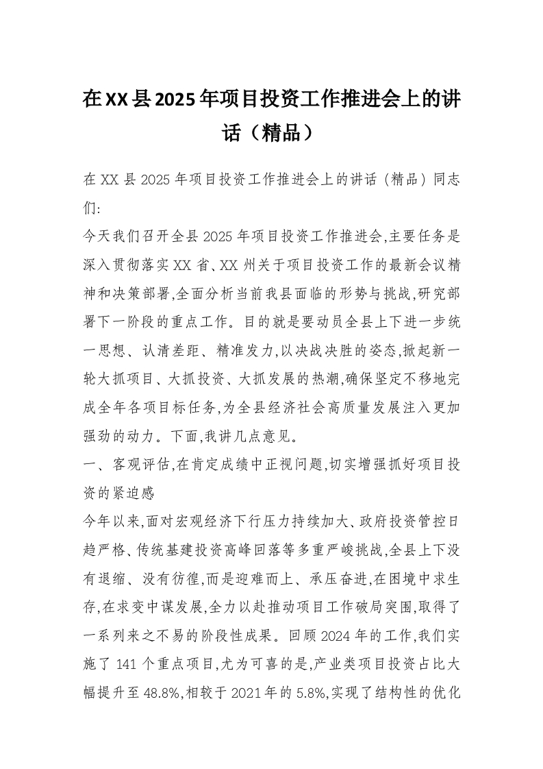 在XX县2025年项目投资工作推进会上的讲话(精品)