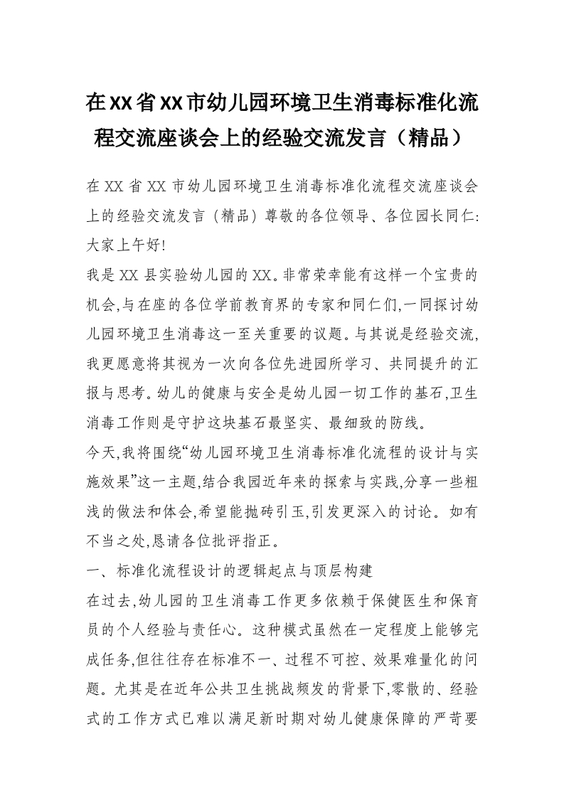 首页材料汇编在XX省XX市幼儿园环境卫生消毒标准化流程交流座谈会上的经验交流发言(精品)
