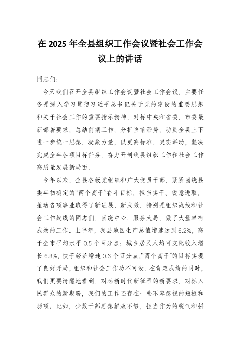 在2025年全县组织工作会议暨社会工作会议上的讲话