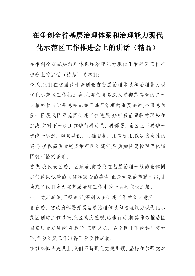 在争创全省基层治理体系和治理能力现代化示范区工作推进会上的讲话(精品)