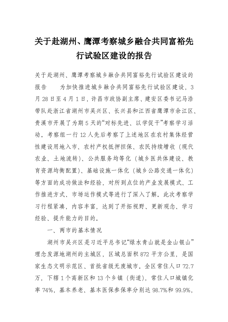 关于赴湖州、鹰潭考察城乡融合共同富裕先行试验区建设的报告