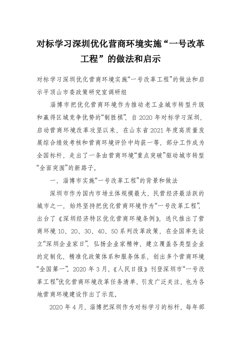 对标学习深圳优化营商环境实施“一号改革工程”的做法和启示