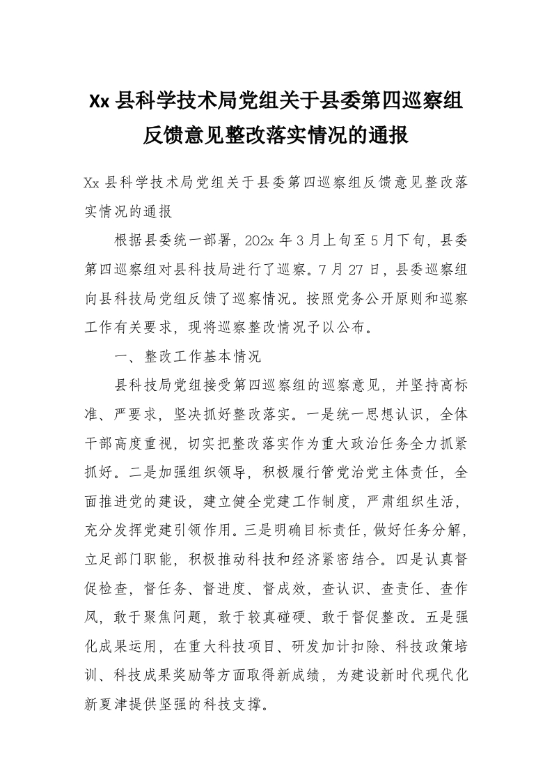 Xx县科学技术局党组关于县委第四巡察组反馈意见整改落实情况的通报