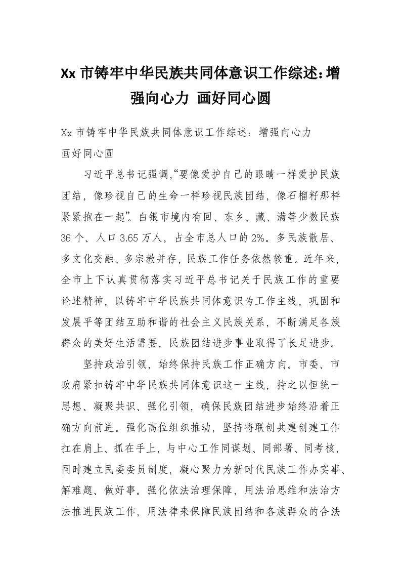Xx市铸牢中华民族共同体意识工作综述:增强向心力 画好同心圆