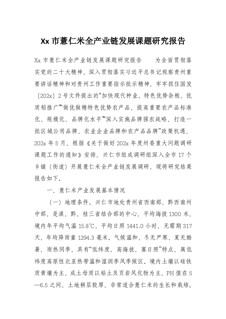Xx市薏仁米全产业链发展课题研究报告