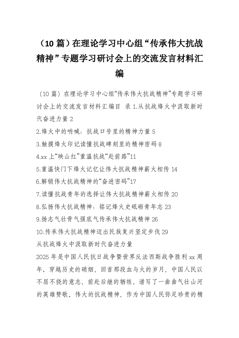 首页写作素材(10篇)在理论学习中心组“传承伟大抗战精神”专题学习研讨会上的交流发言材料汇编