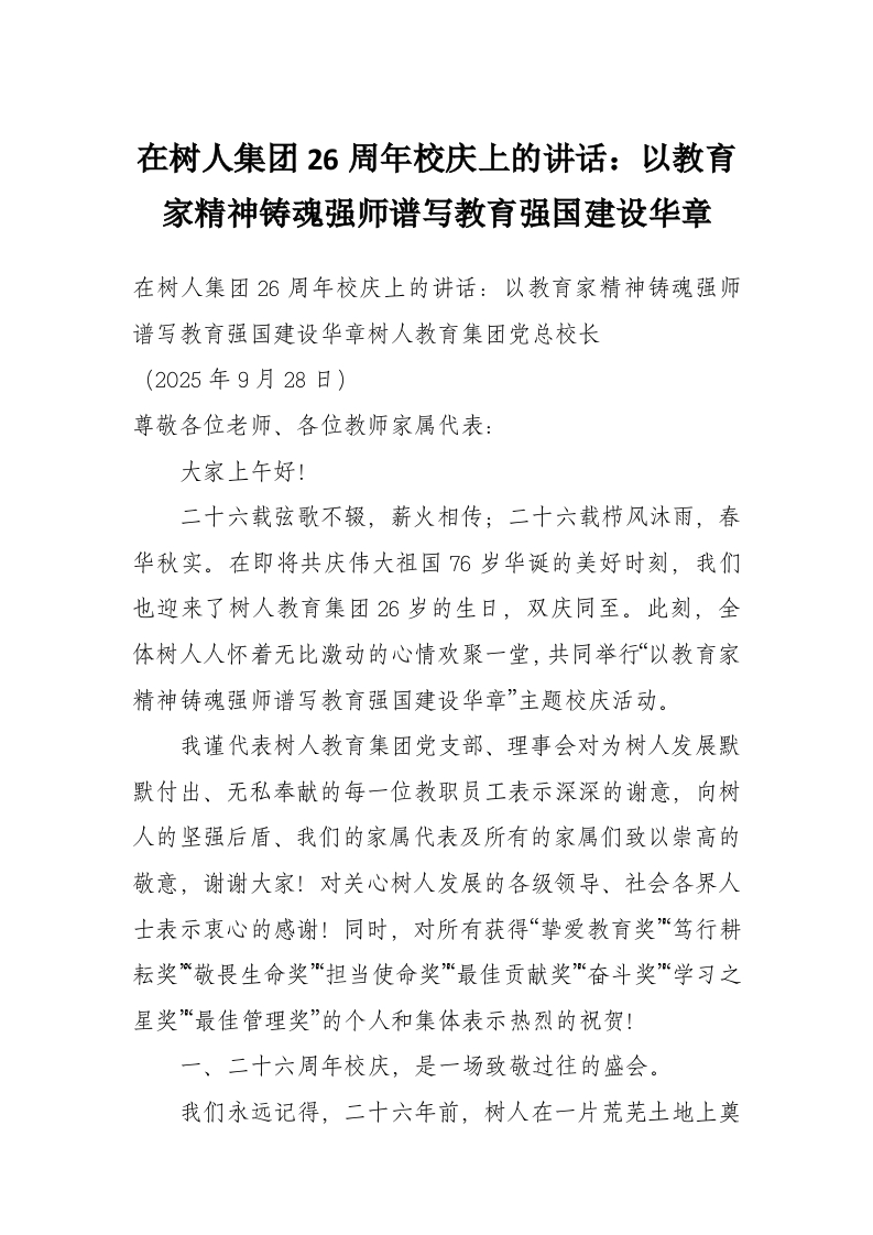 在树人集团26周年校庆上的讲话:以教育家精神铸魂强师谱写教育强国建设华章