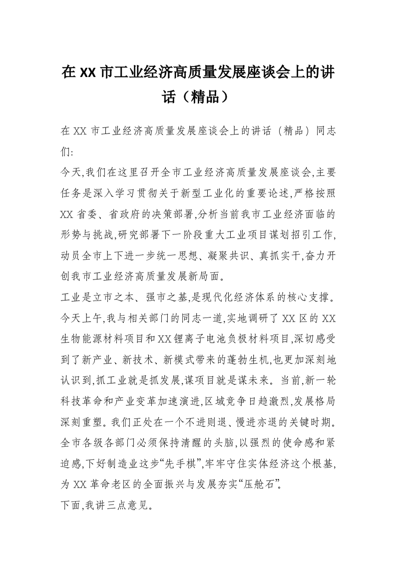 在XX市工业经济高质量发展座谈会上的讲话(精品)