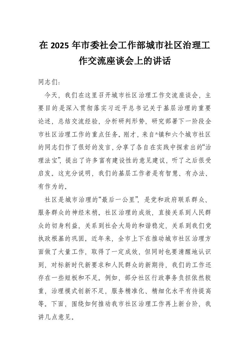 在2025年市委社会工作部城市社区治理工作交流座谈会上的讲话