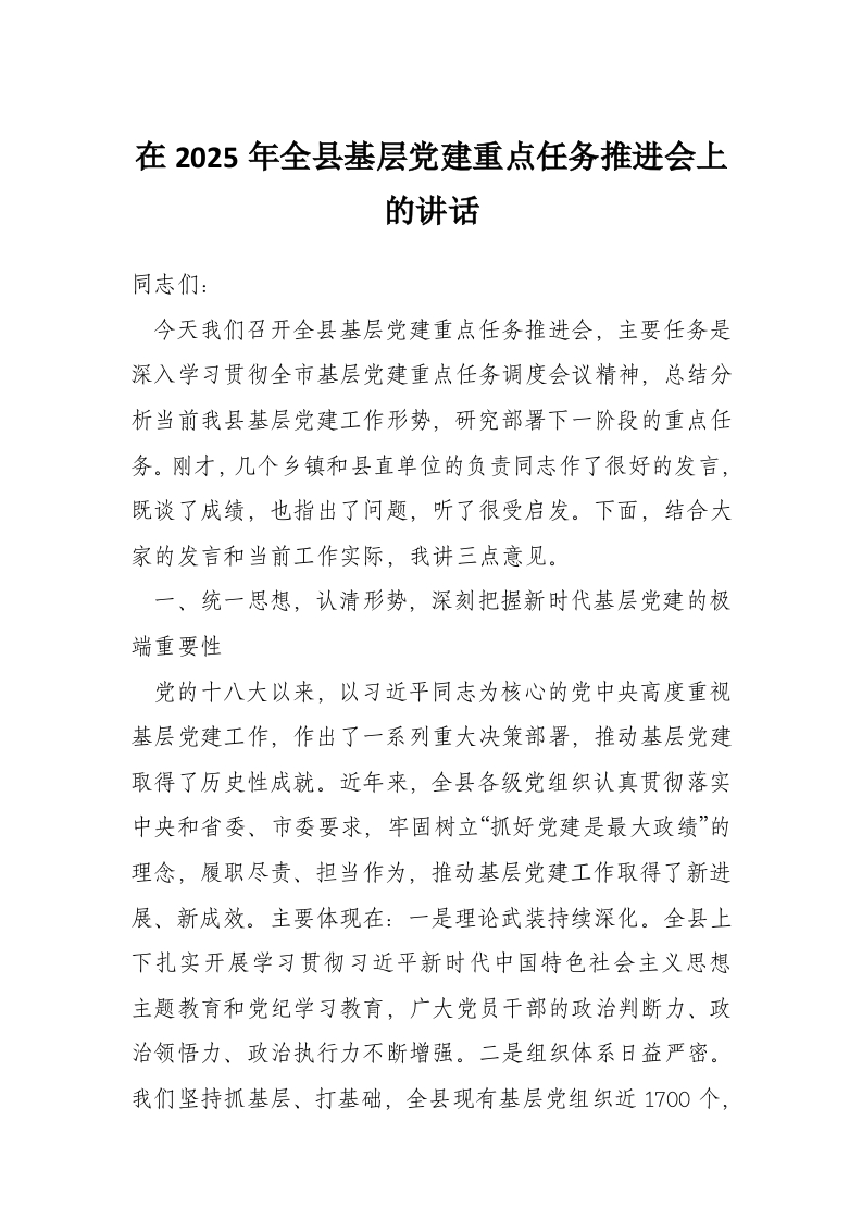 在2025年全县基层党建重点任务推进会上的讲话