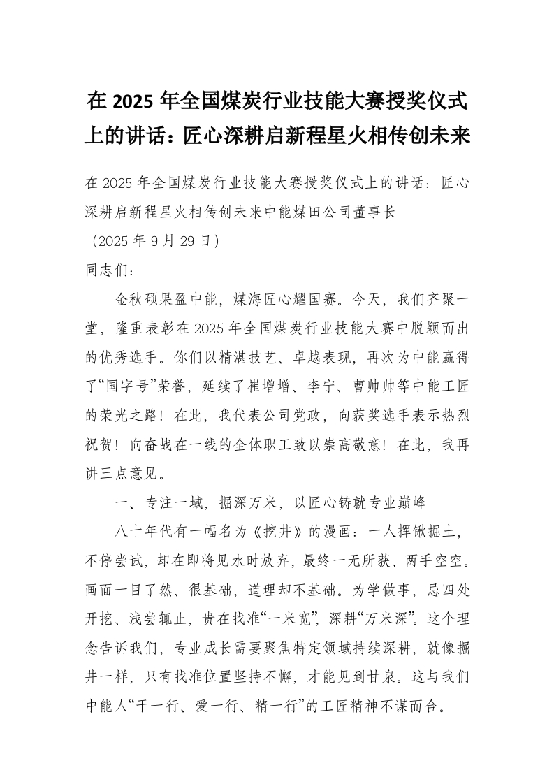 首页精选范文在2025年全国煤炭行业技能大赛授奖仪式上的讲话:匠心深耕启新程星火相传创未来