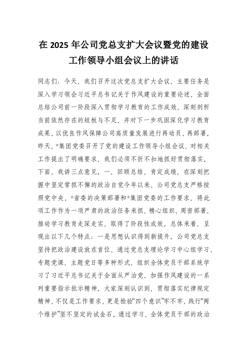 首页精选范文在2025年公司党总支扩大会议暨党的建设工作领导小组会议上的讲话
