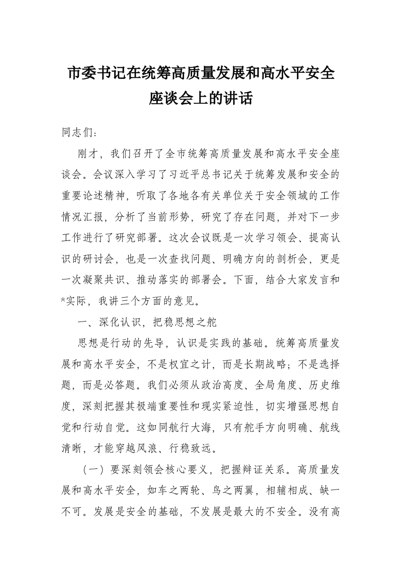 市委书记在统筹高质量发展和高水平安全座谈会上的讲话