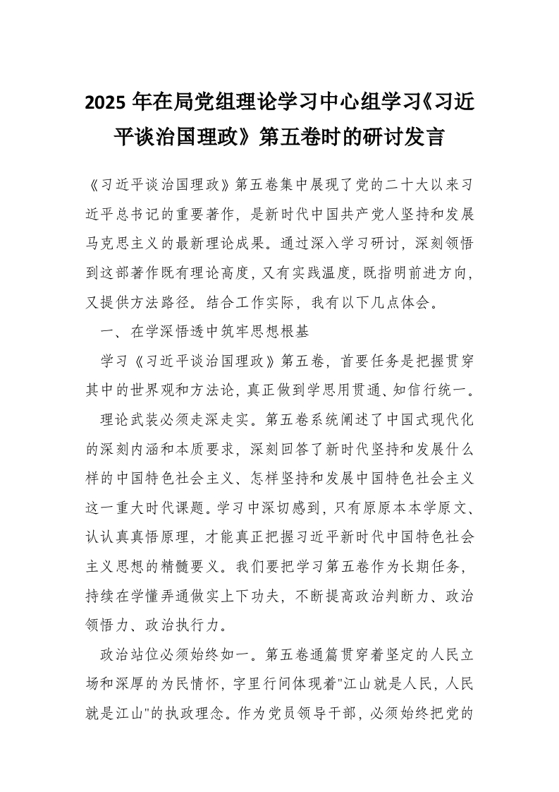 首页讲课讲稿2025年在局党组理论学习中心组学习《***谈治国理政》第五卷时的研讨发言