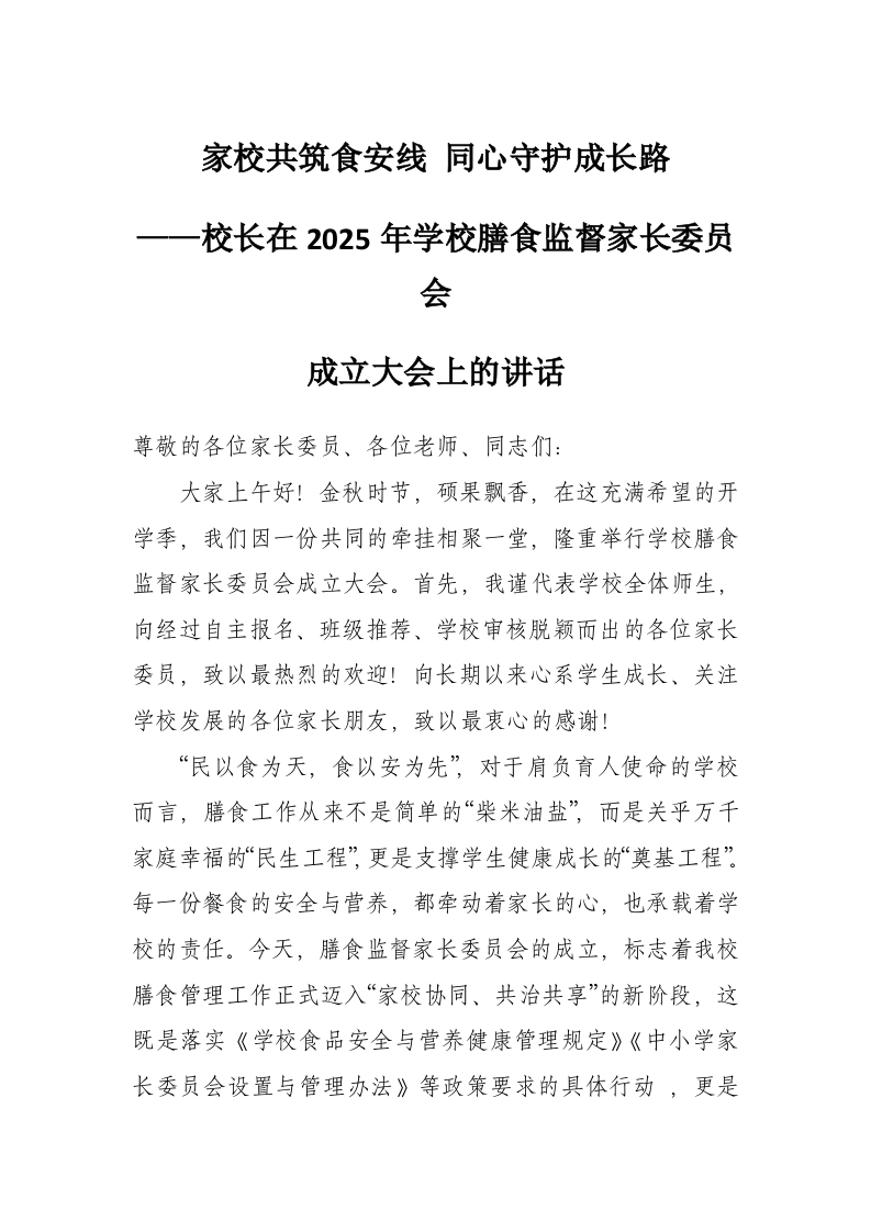 在2025年学校膳食监督家长委员会成立大会上的讲话:家校共筑食安线 同心守护成长路