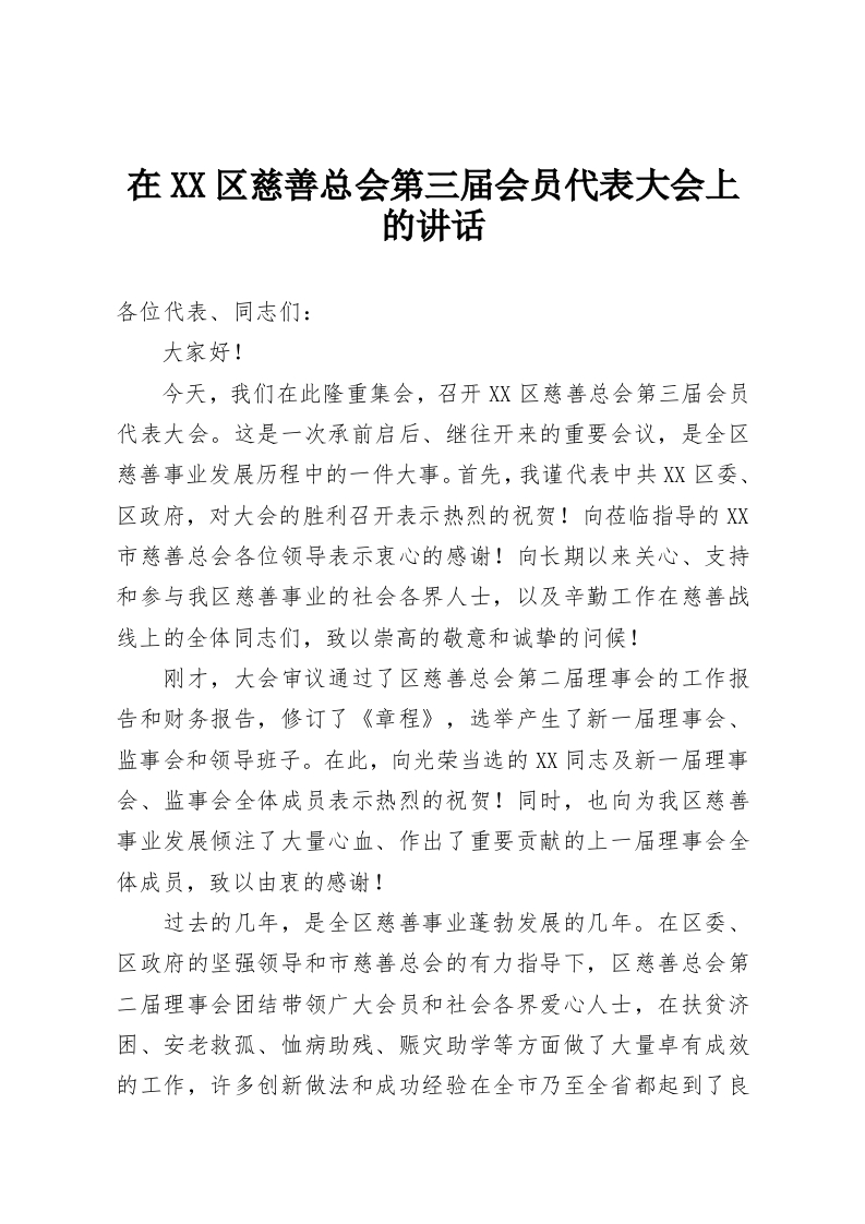 首页工作文档在XX区慈善总会第三届会员代表大会上的讲话