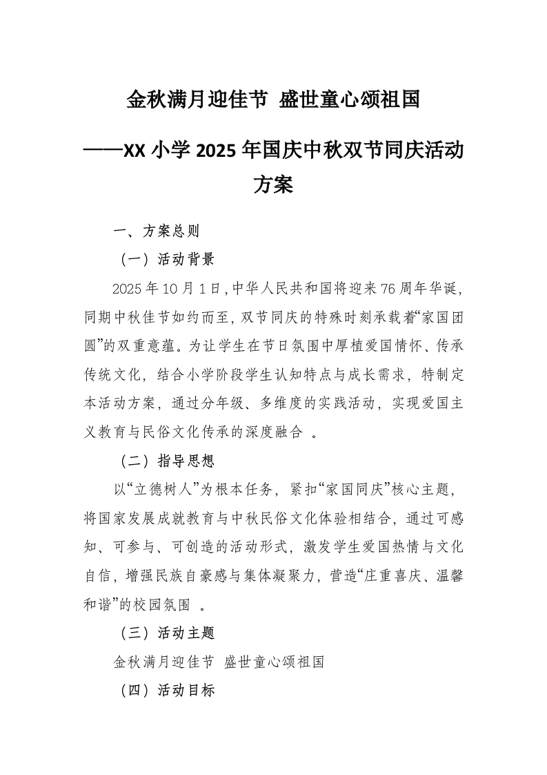 XX小学2025年国庆中秋双节同庆活动方案:金秋满月迎佳节 盛世童心颂祖国