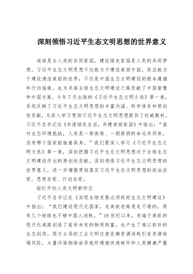 首页工作文档深刻领悟***生态文明思想的世界意义