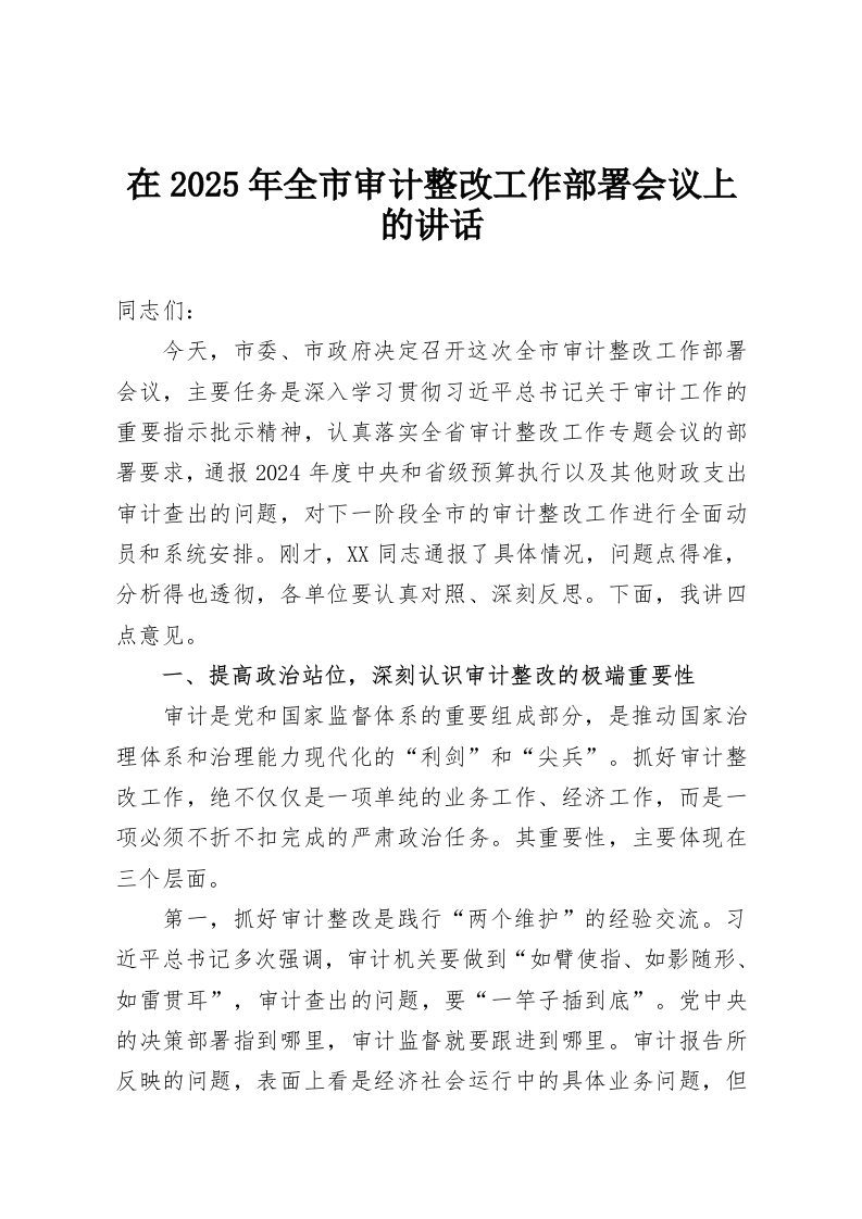 首页工作文档在2025年全市审计整改工作部署会议上的讲话