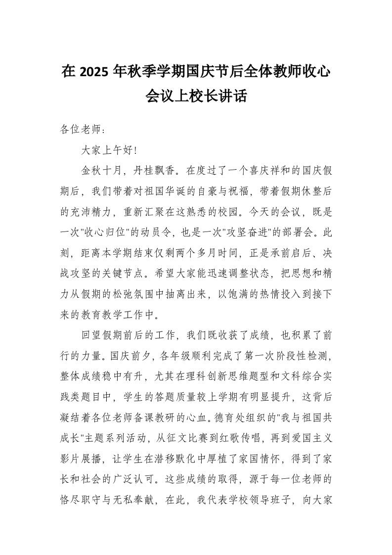 在2025年秋季学期国庆节后全体教师收心会议上校长讲话 1