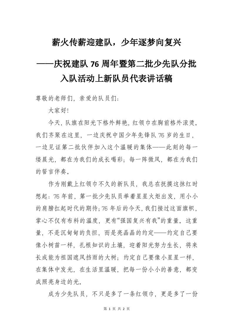 庆祝建队76周年暨第二批少先队分批入队活动上新队员代表讲话稿:薪火传薪迎建队,少年逐梦向复兴