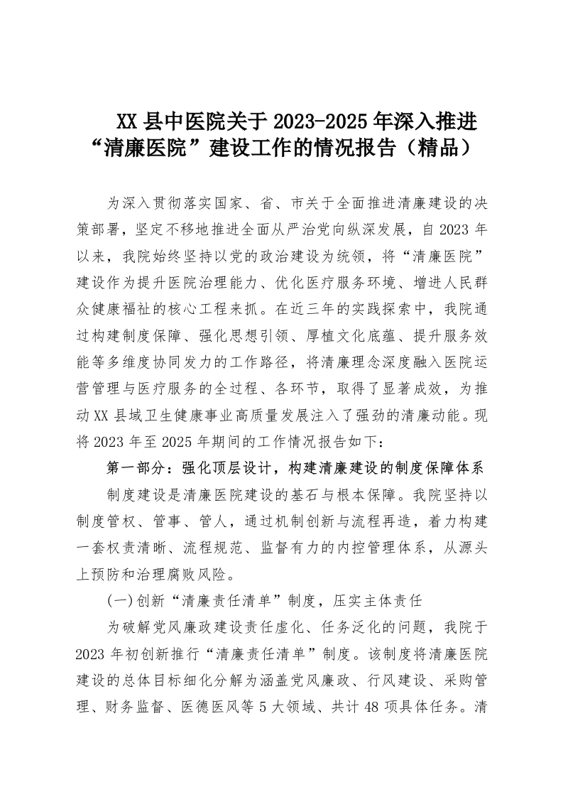XX县中医院关于2023-2025年深入推进“清廉医院”建设工作的情况报告(精品)