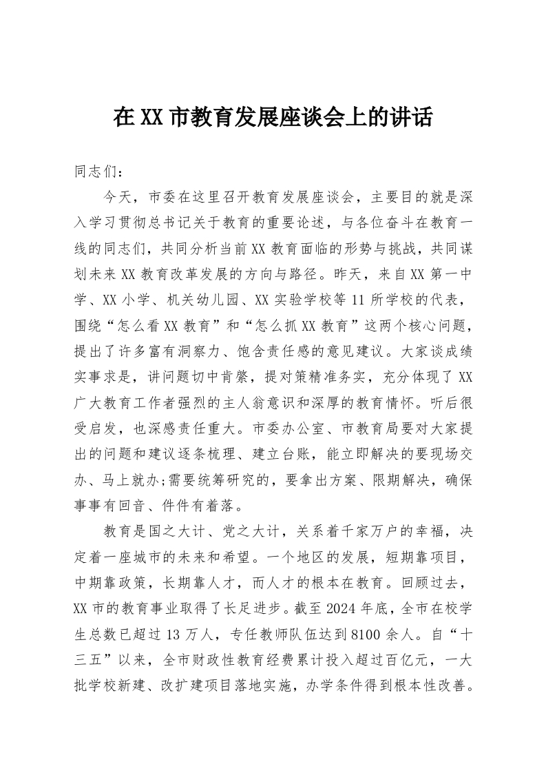 在XX市教育发展座谈会上的讲话