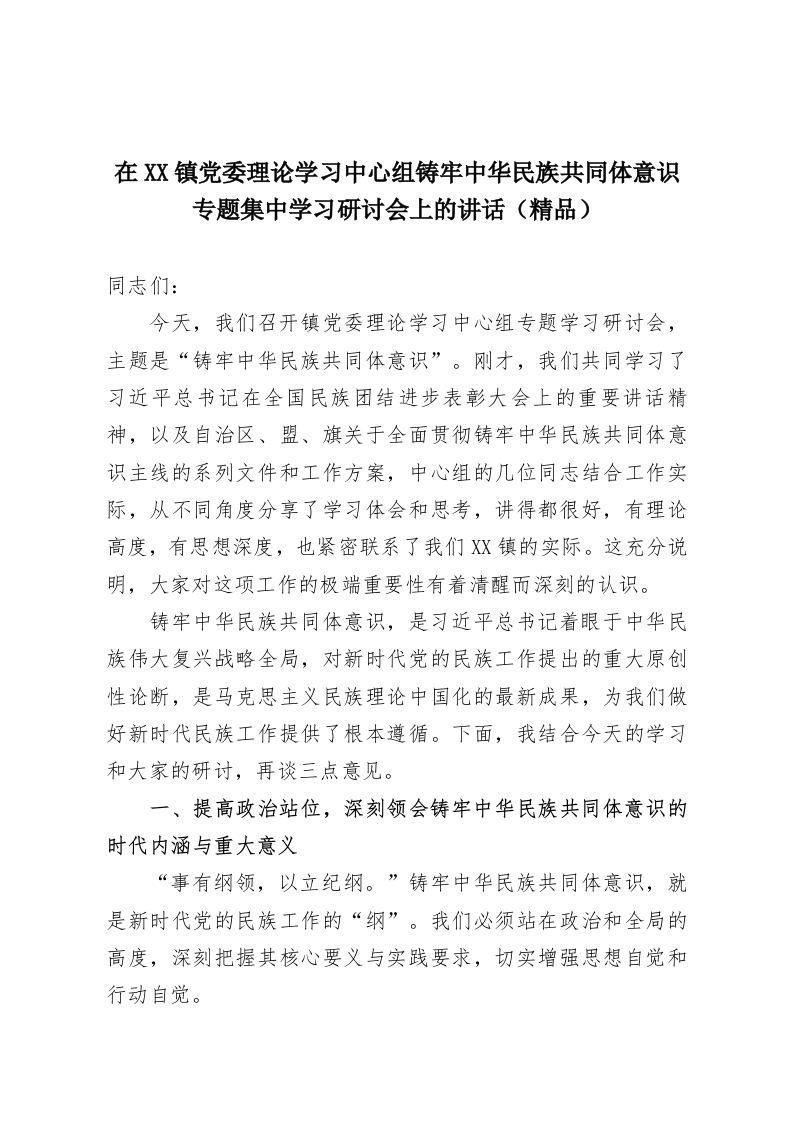 在XX镇党委理论学习中心组铸牢中华民族共同体意识专题集中学习研讨会上的讲话(精品)
