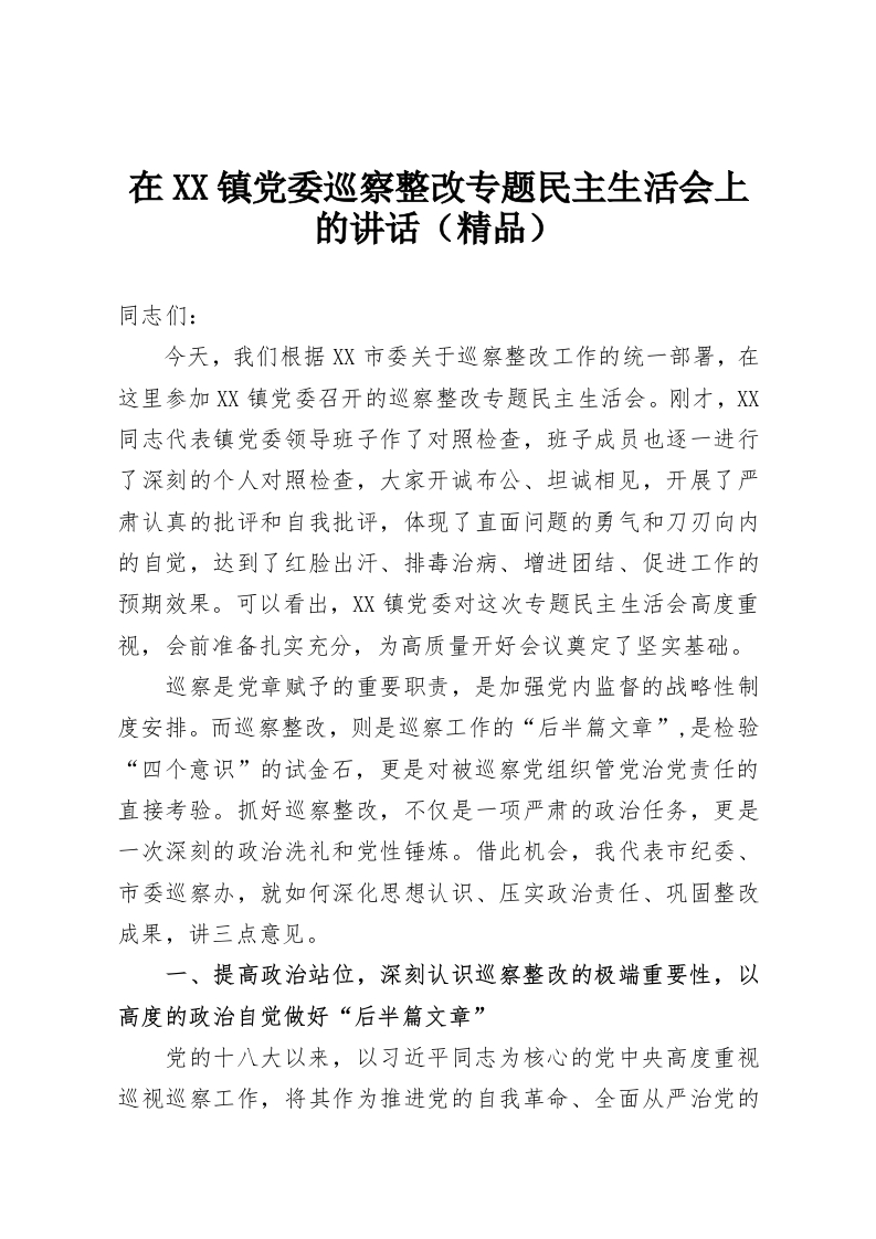 首页工作文档在XX镇党委巡察整改专题民主生活会上的讲话(精品)