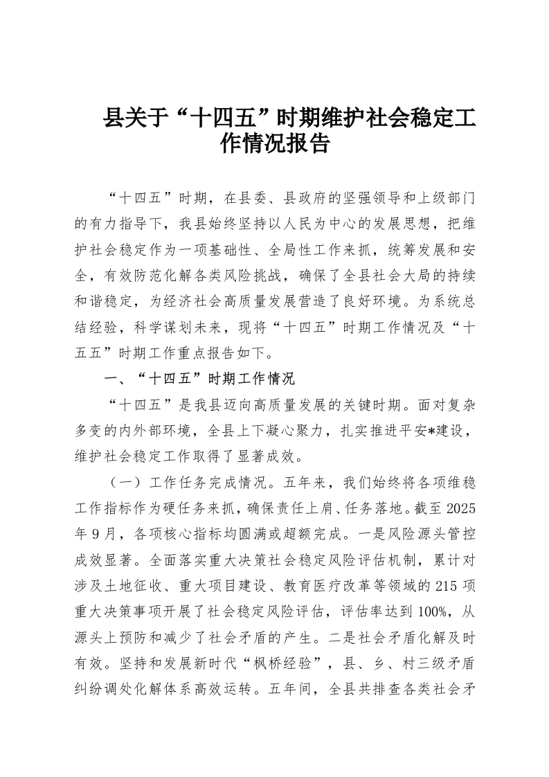 首页工作文档县关于“十四五”时期维护社会稳定工作情况报告