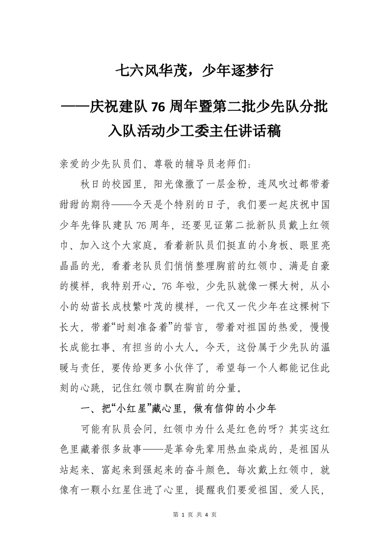 庆祝建队76周年暨第二批少先队分批入队活动少工委主任讲话稿:七六风华茂,少年逐梦行