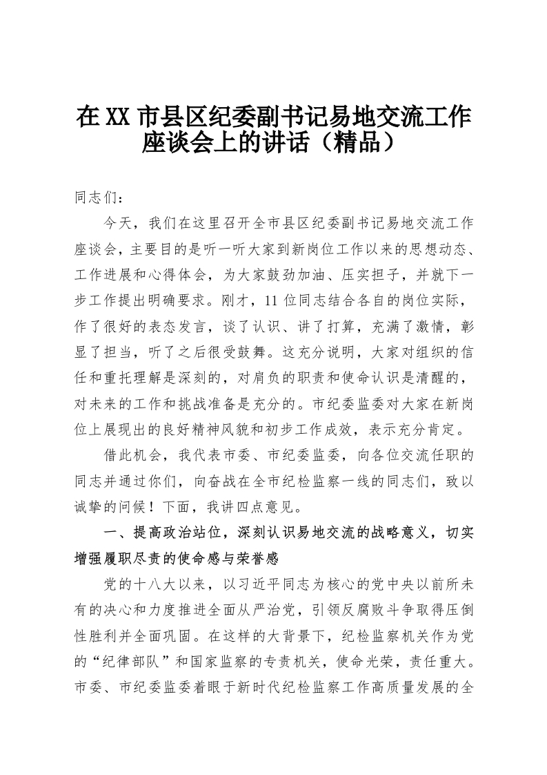 在XX市县区纪委副书记易地交流工作座谈会上的讲话(精品)