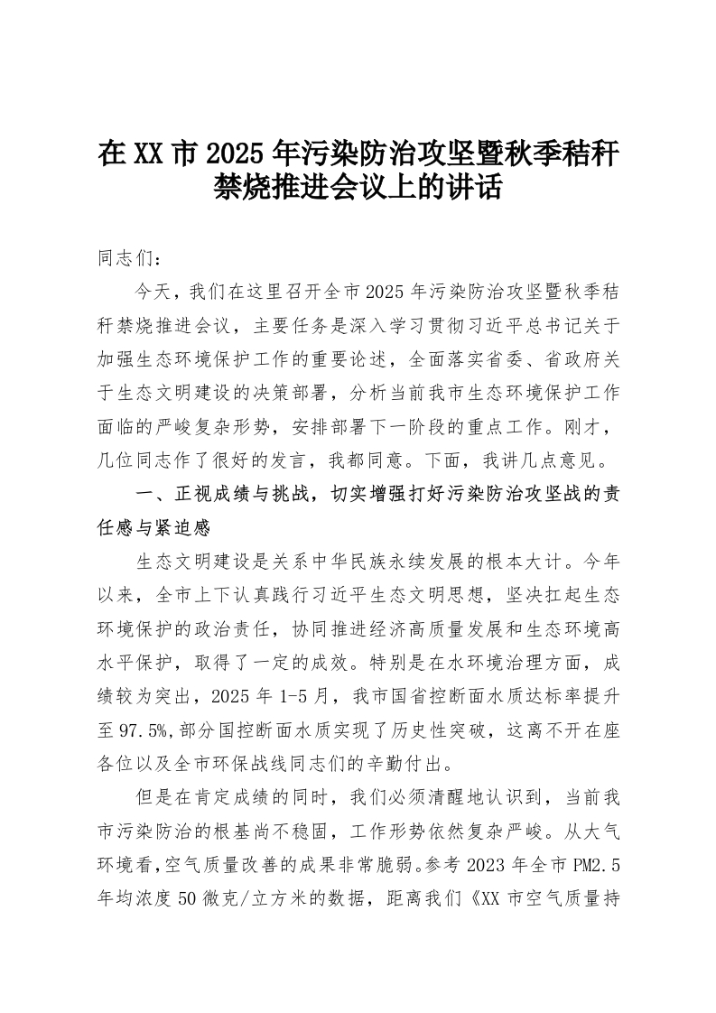 在XX市2025年污染防治攻坚暨秋季秸秆禁烧推进会议上的讲话