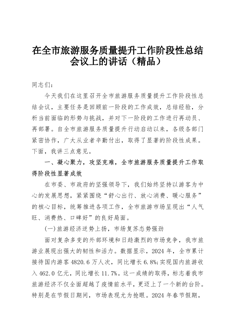 在全市旅游服务质量提升工作阶段性总结会议上的讲话(精品)