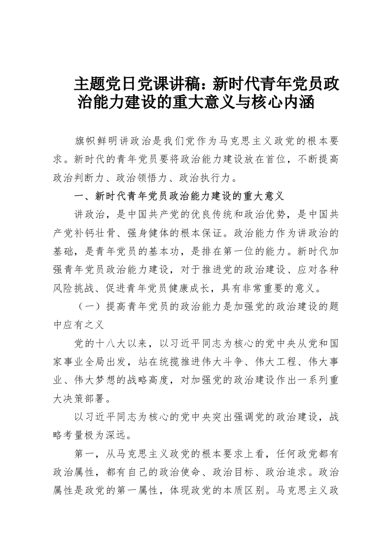 主题党日党课讲稿:新时代青年党员政治能力建设的重大意义与核心内涵